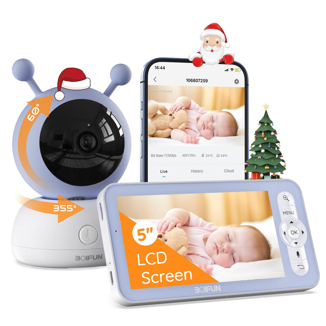 BOIFUN Babyphone 5" – Caméra 360°, IPS, Vision Nocturne, 3050 mAh, Sans WiFi